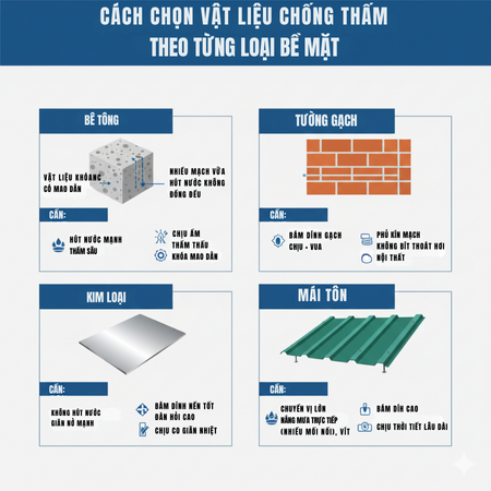 Cách chọn vật liệu chống thấm đúng theo từng bề mặt như bê tông, gạch, kim loại và mái tôn, minh họa sự khác biệt đặc tính bề mặt và vật liệu phù hợp để tránh chống thấm thất bại.
