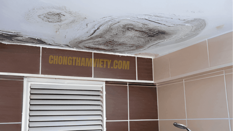 Trước hết là thấm lan xuống trần và tường tầng dưới. Nước tích tụ trong kết cấu sàn sẽ tìm đường thoát ra tại các điểm yếu như trần thạch cao, mạch tiếp giáp dầm – sàn, hoặc chân tường, gây ố vàng, bong sơn và nấm mốc. Đây là dấu hiệu phổ biến nhất khiến chủ nhà mới phát hiện sự cố.