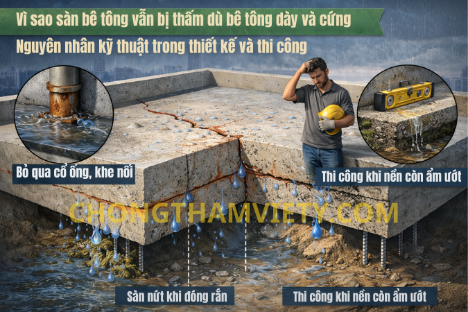 Sàn bê tông dày vẫn bị thấm do bỏ qua cổ ống, mạch ngừng và thi công khi nền chưa ổn định