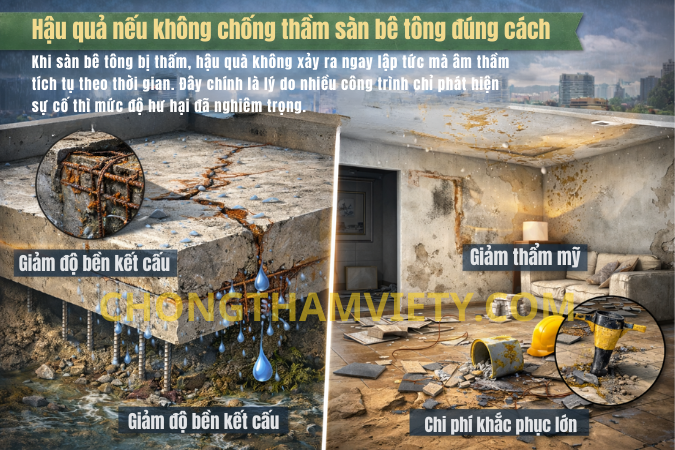 Hậu quả thấm sàn bê tông gây ăn mòn cốt thép, bong gạch, giảm độ bền kết cấu và chi phí sửa chữa lớn