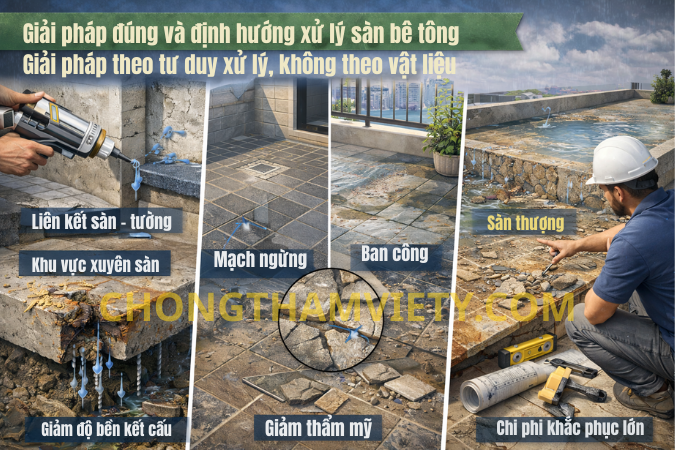 Một kinh nghiệm quan trọng là luôn coi sàn bê tông là một phần của hệ thống, liên kết chặt chẽ với tường, ống kỹ thuật và các hạng mục xung quanh. Khi chỉ xử lý riêng lẻ từng vị trí, nguy cơ thấm tái phát gần như không thể tránh khỏi.