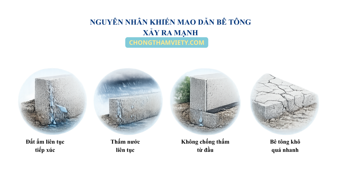 Minh họa các nguyên nhân chính khiến mao dẫn bê tông xảy ra mạnh, bao gồm tiếp xúc ẩm liên tục, nước thấm kéo dài và thiếu chống thấm ngay từ đầu.