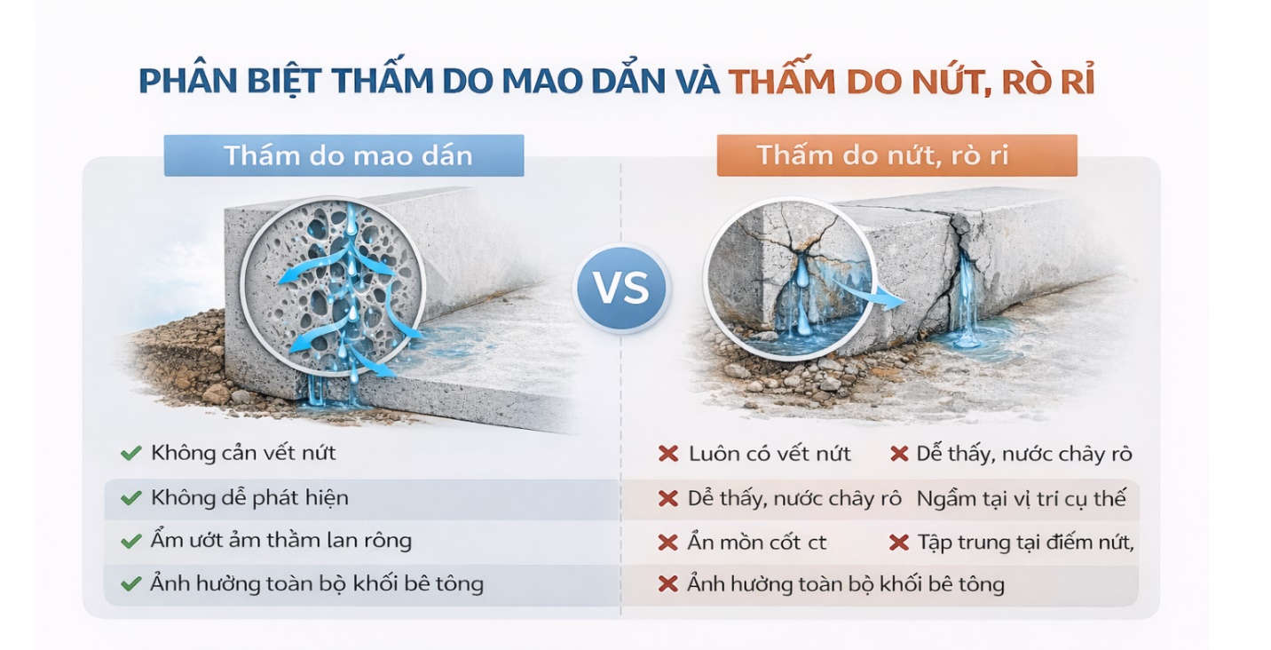 Khác với thấm do nứt (có thể nhìn thấy và xử lý cục bộ), thấm do mao dẫn: